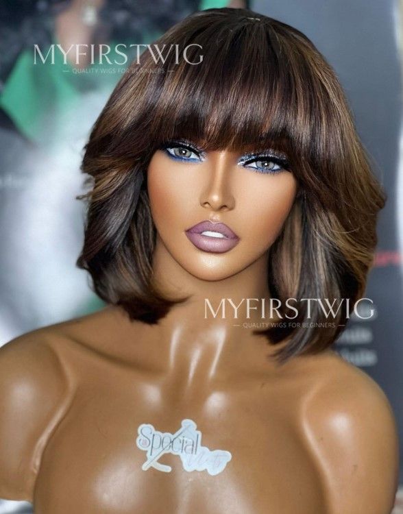 Aspecialunit - Brown Highlight Bob With Bangs Malaysian Human Hair Lace Front Wig - SPE033