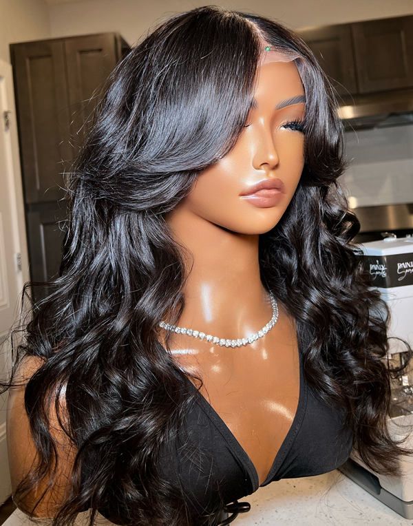Dainty Secrets-Malaysian Hair Long Wavy With Curtain Bangs Lace Front Wig - DTS010