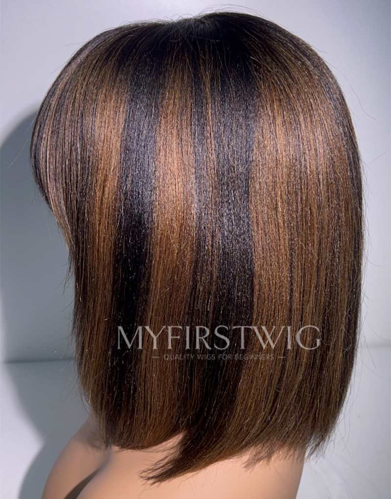 Highlight Brown Yaki Bob With Bangs Glueless Human Hair Lace Front Wig - ZP001