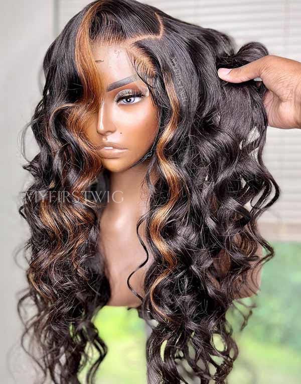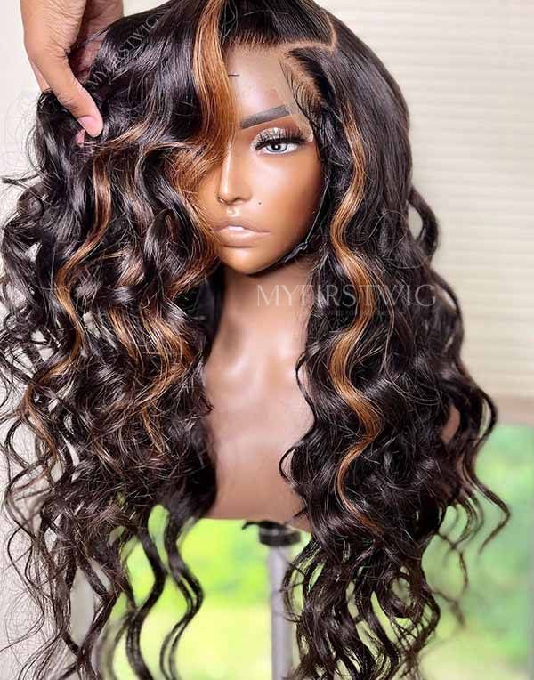 TiaDwana- Malaysian Human Hair Blonde Side Part Money Piece Wavy Lace Front Wig - TDC007