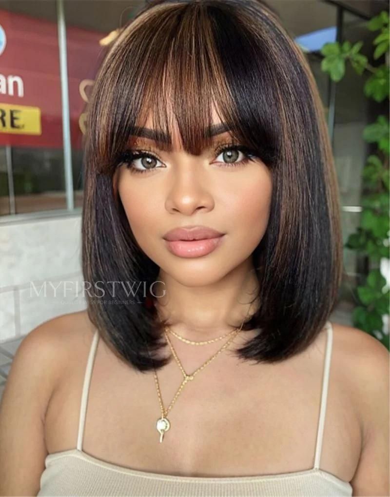 10-12 Inch Highlight Brown Bob with Bangs HD Lace Wear & Go Glueless Closure Wig - BFB018