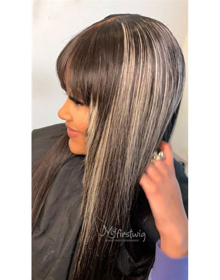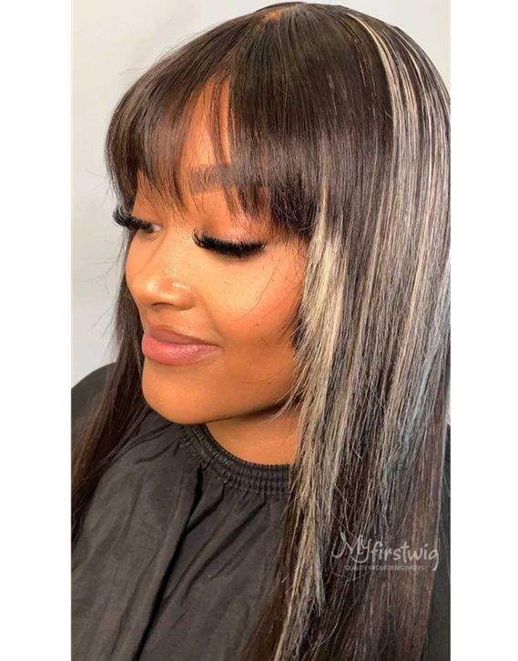 Ggalore- Highlight Grey Layers Straight Wig With Bangs Malaysian Human Hair - GG005
