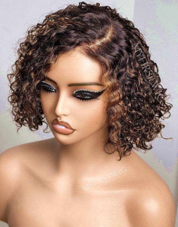 Brown Highlight Short Curly Glueless Human Hair Invisible Lace Wig - April005