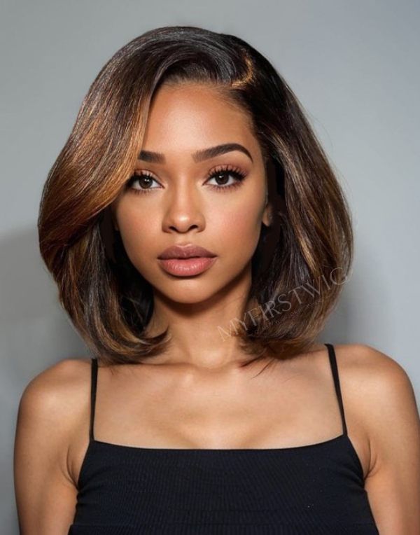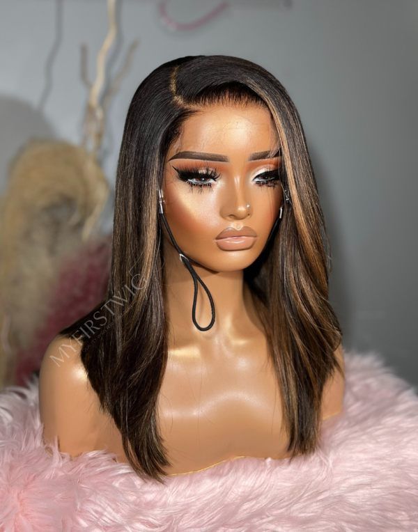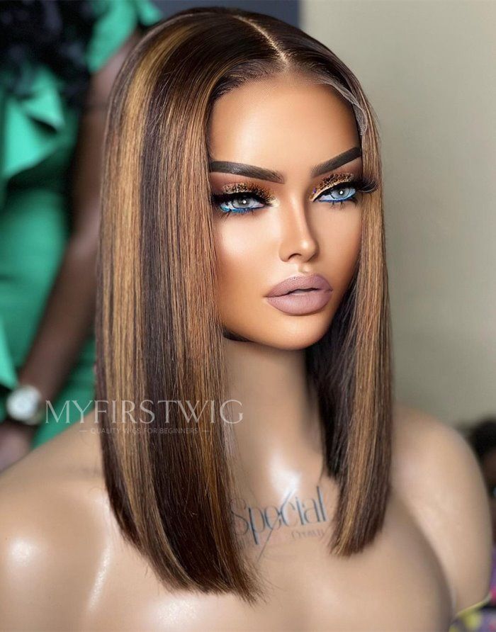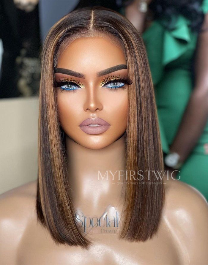 TOUCHEDBYAYE - Brown Highlight Blunt Cut Bob Glueless Human Hair Lace Front Wigs - TBA044