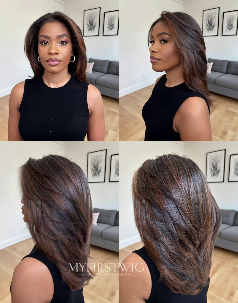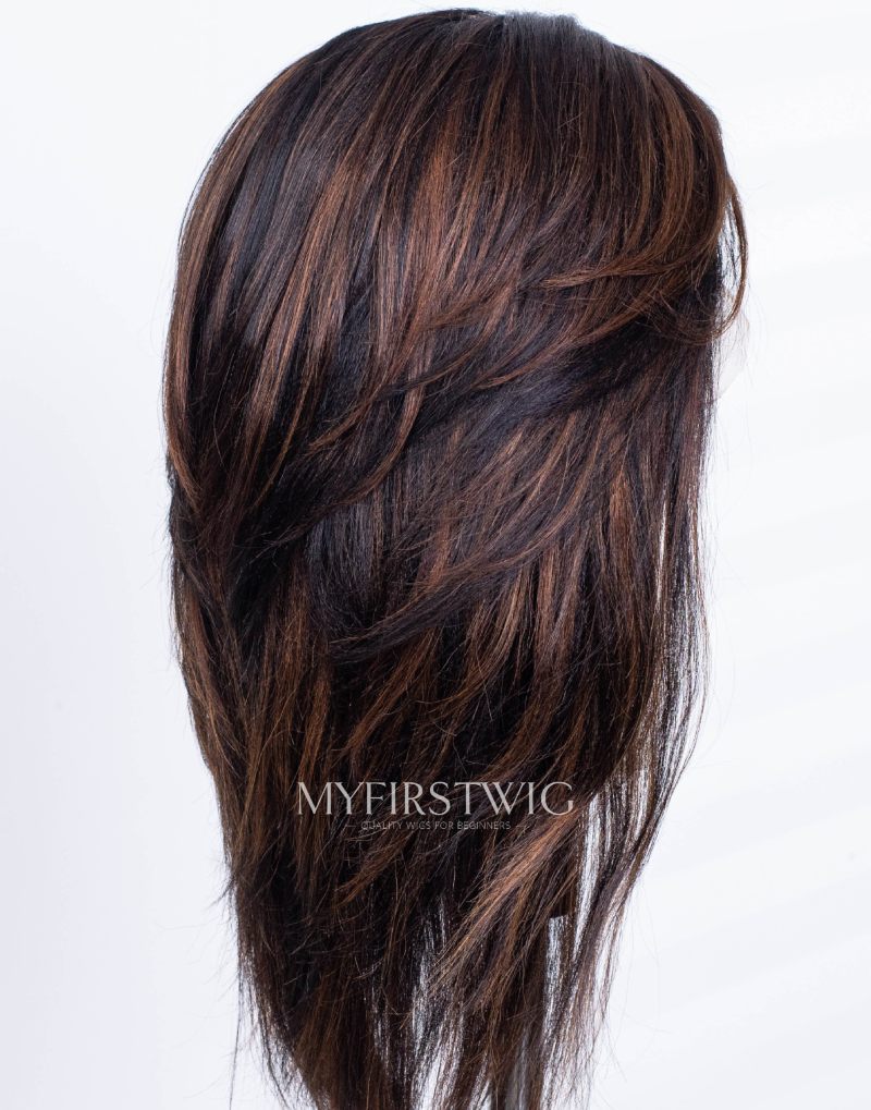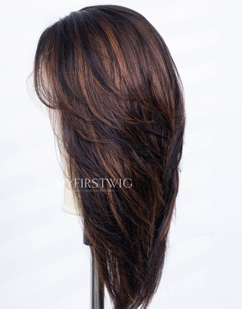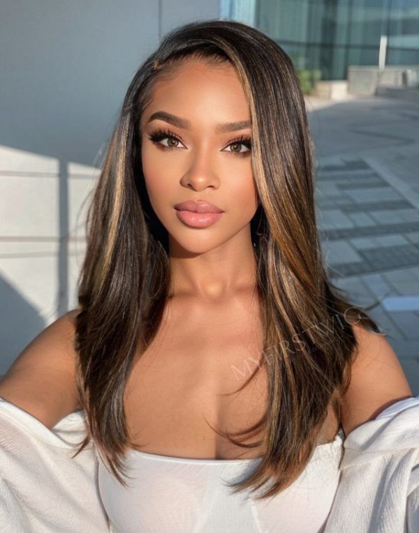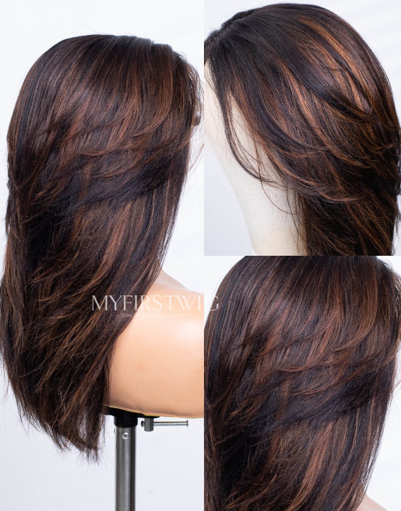 Full Layered Cut Yaki Straight Brown Highlight Glueless Invisible Lace Front Wigs - MAI006